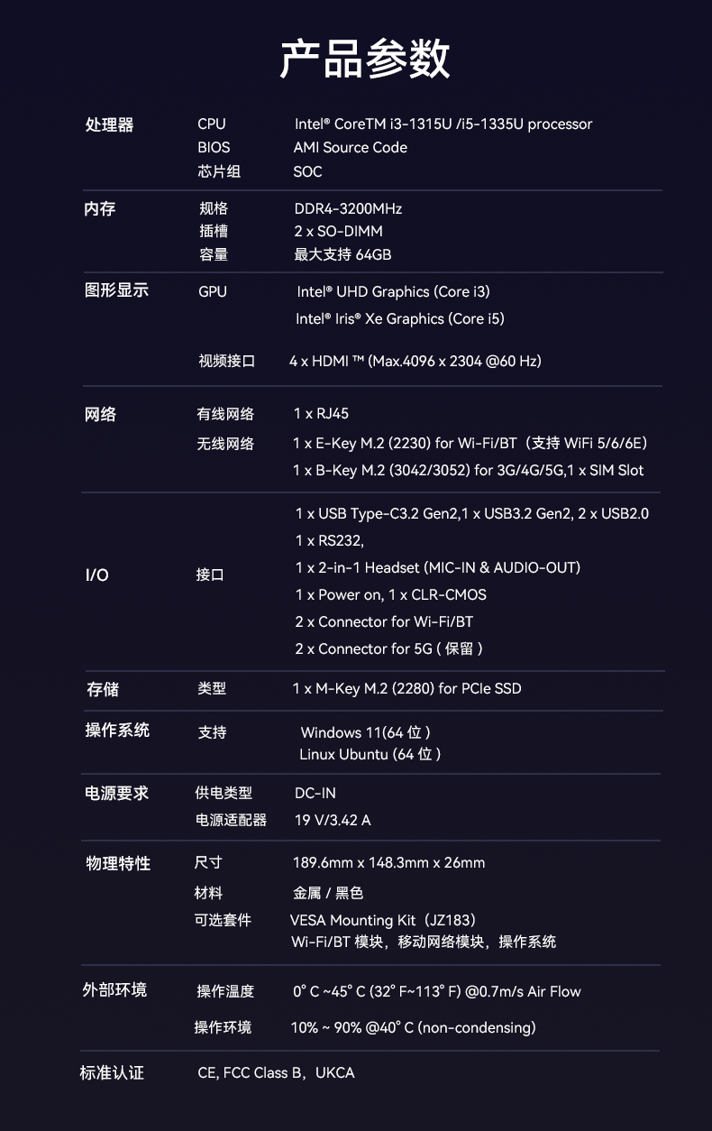 凯发(中国)科技D613采用英特尔Raptor Lake酷睿i3-1315U/i5-1335U 处理器,作为一款性能强悍的主机,它的TDP仅15W,能有效降低能耗,延长电池寿命。在内存方面,D613采用2 x SO-DIMM DDR4-3200 MHz,最大可达64GB,并配备1 x M-Key M.2 (2280) for PCIe SSD。