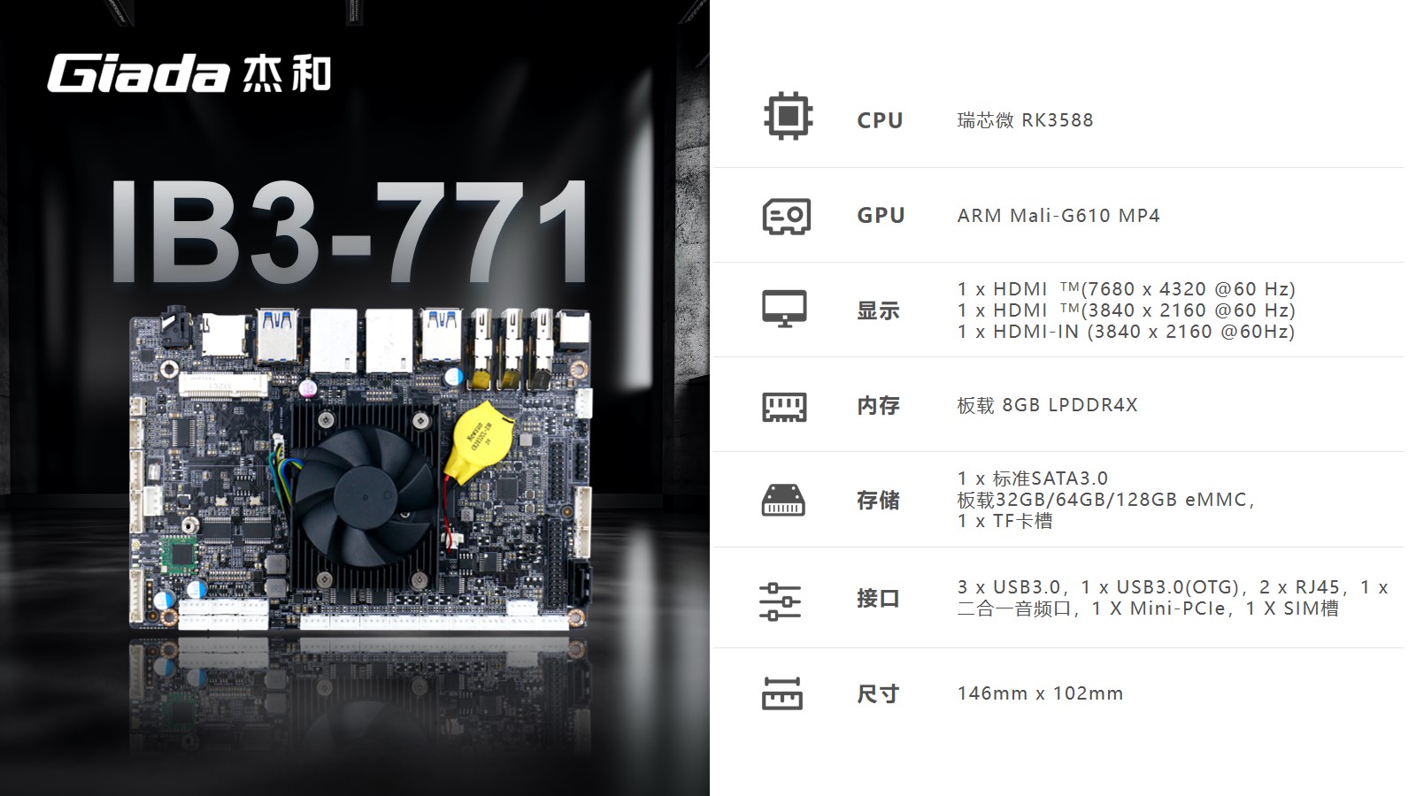 凯发(中国)工业级ARM主板IB3-771采用瑞芯微RK3588处理器,内置G610 MP4 GPU,拥有6 TOPS算力的NPU,支持8K视频硬件解码编码及多摄像头输入,支持eDP/DP/ HDMI2.1/MIPI 多种显示接口。