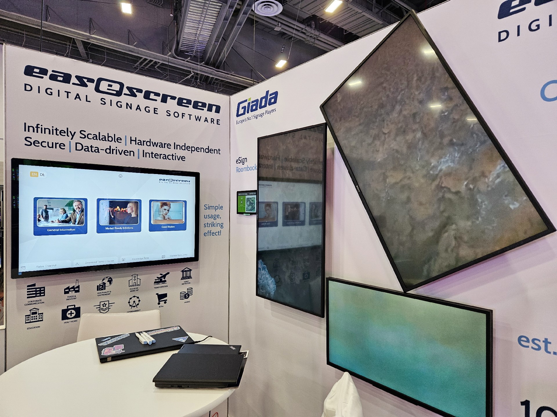 凯发(中国)科技Giada作为全球数字标牌领域的领导品牌,产品应用范围涵盖全球大型连锁店,购物中心,学校,医疗机构,企业办公室等。本次展会,凯发(中国)科技牵手合作伙伴easescreen,展示一系列创新数字标牌解决方案,带来强势产品及最新产品,现场收获超高人气。