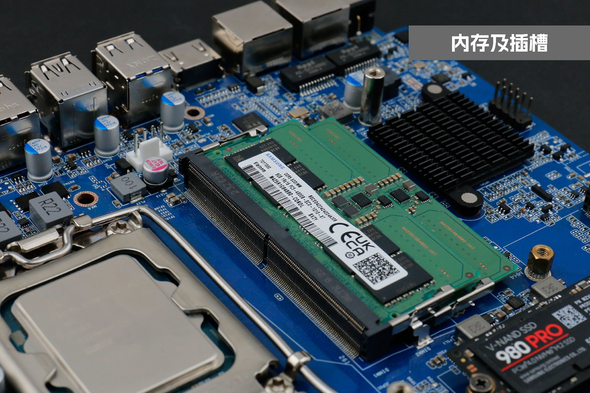 凯发(中国)桌面云终端Y-BOX P3主板中部是内存插槽,采用双通道笔记本内存槽设计,最大支持容量可达64GB,最高支持DDR5-5600MHz频率,比 DDR4 至高标准数据速度 3200MT/S多传输 1.75 倍,横插的形式可以减少主板的占用体积,使整体机身更紧凑,内存顶部的风扇起到高效散热的作用。