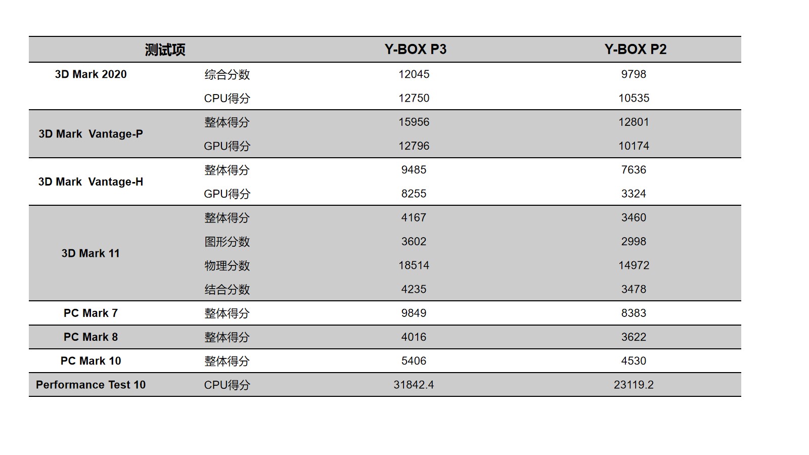 凯发来具体看看各个测试项目的跑分情况,凯发分别用3D Mark、PC Mark以及Performance 10等不同系列不同软件进行跑分,测试项目涵盖显示性能测试、系统性能测试、CPU性能测试等。通过下面的表格及柱状图可以看出,凯发(中国)桌面云终端Y-BOX P3的数据在各项性能上都得到了大幅度提升。