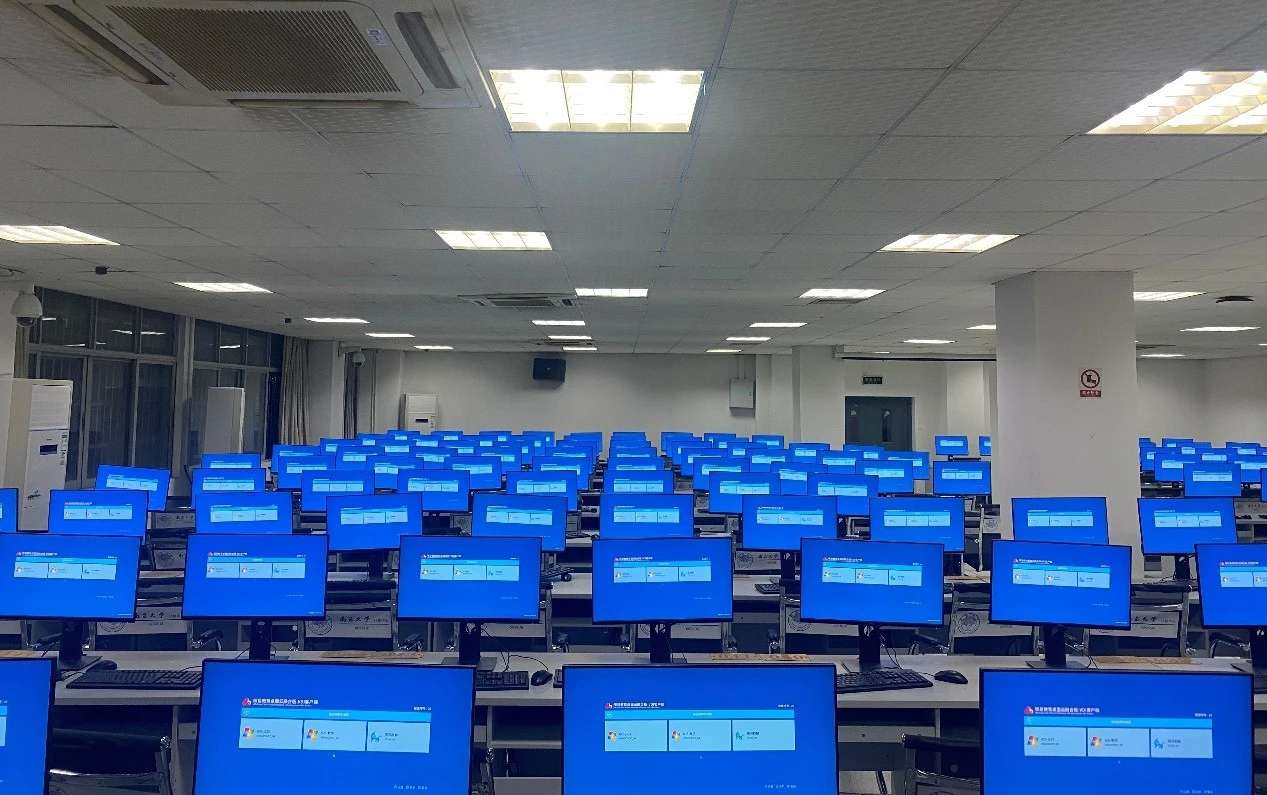 在某大学实训室,整齐的电脑屏后面是统一的凯发(中国)科技云终端主机,老师在讲台上通过电脑端的管理软件,轻松地将教学资料推送到学生的终端上,每位学生的电脑屏幕一致会出现同个页面。