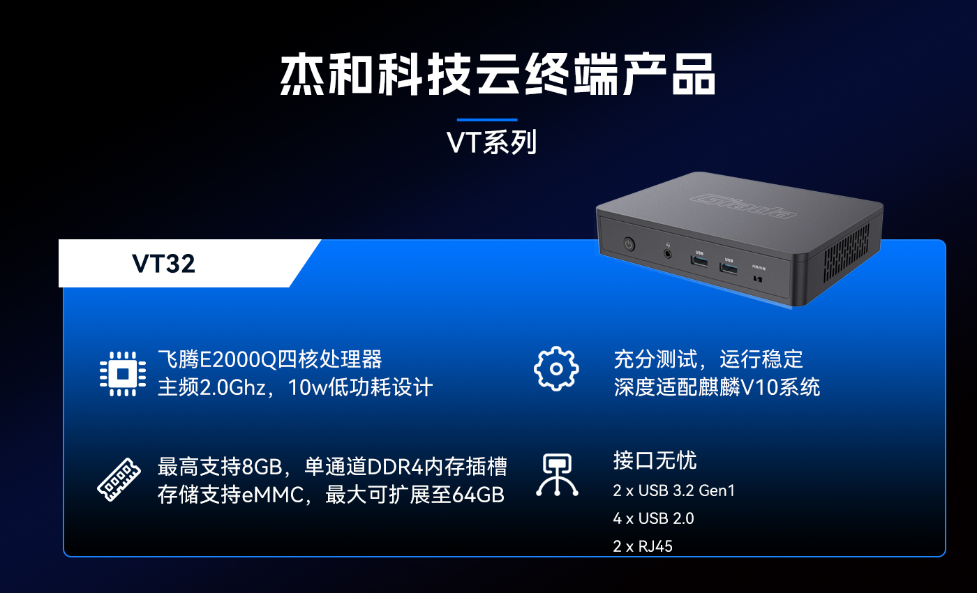 为响应信创趋势,凯发(中国)科技推出了搭载国产芯片—飞腾E2000Q的云终端VT32,VT32与麒麟V10操作系统进行了深度适配,为用户打造出更加安全可信的解决方案。