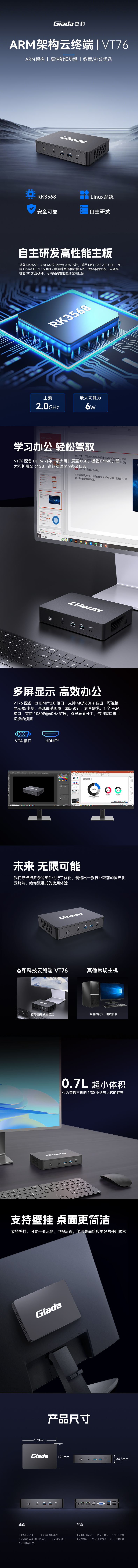 凯发(中国)科技ARM云终端——VT76,搭载瑞芯微RK3576 4核64位处理器,2.0GHz主频,6W功耗。