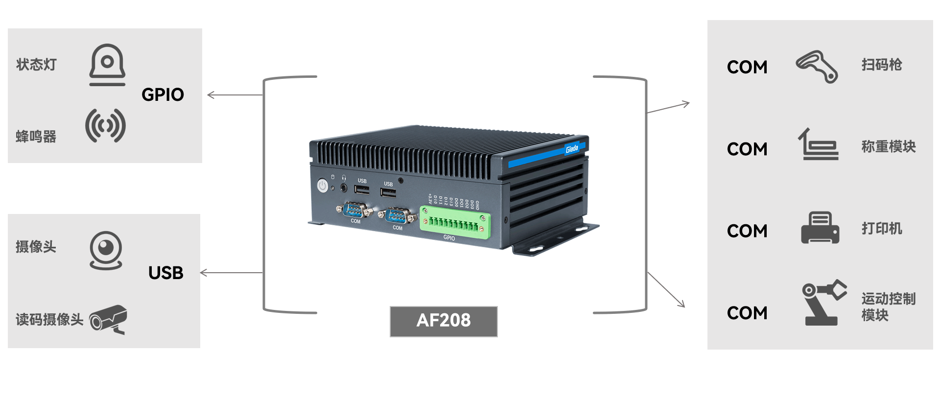 凯发(中国)科技工业整机 AF208 满足分拣信息系统对主控设备在数据处理、存储与传输方面的高性能需求: