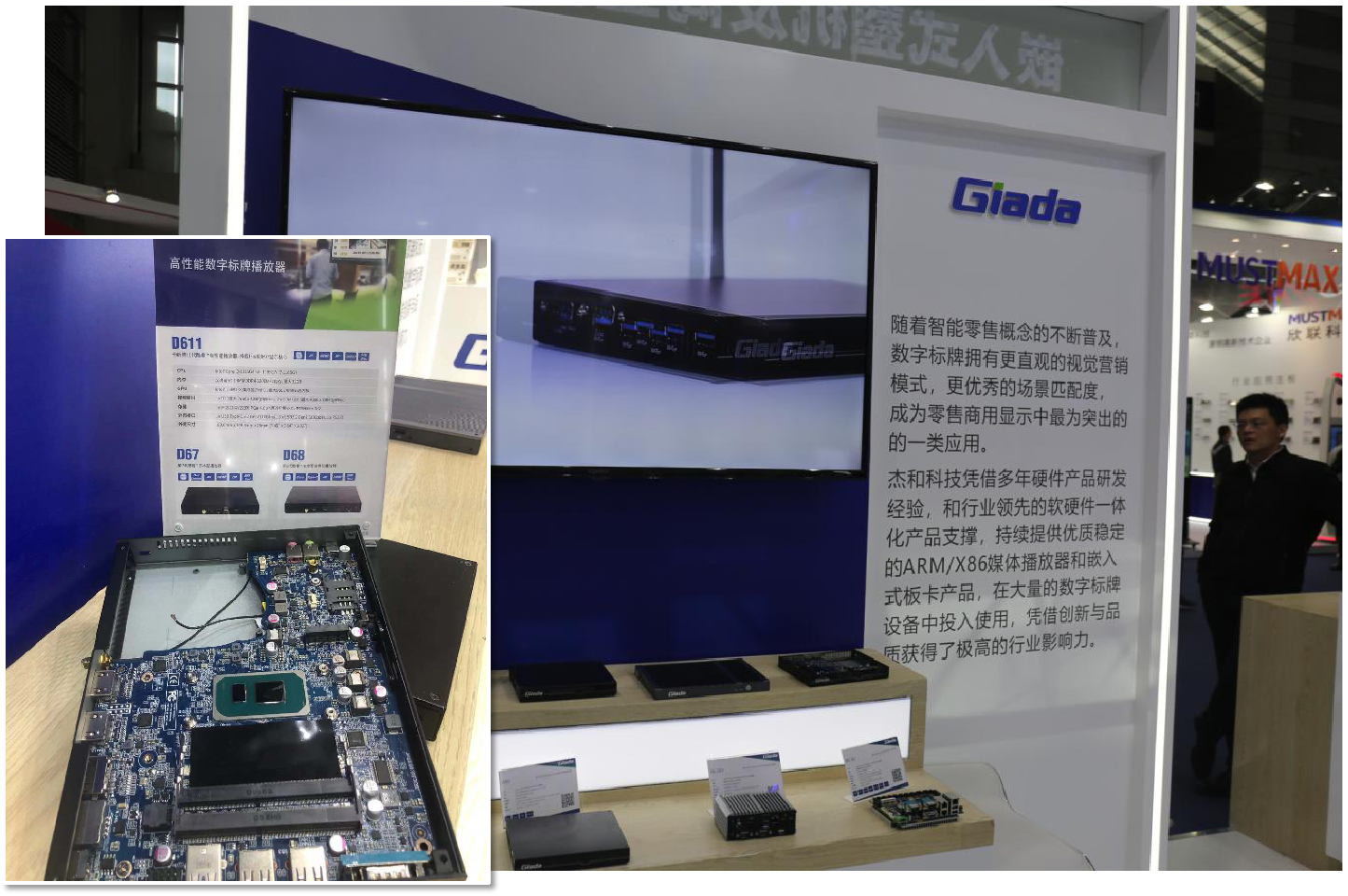 步入凯发(中国)科技展位,首先呈现的是凯发(中国)科技近年的商用显示ARM产品集和GDSM广告精准推送演示。凯发(中国)科技DN系列媒体播放器分别使用了瑞芯微RK3288、RK3328和RK3399三款核心芯片;全部采用116mm*107mm*30mm的紧凑外观设计,轻便灵活;搭载RK3399的DN74媒体播放盒具备双屏4K异显输出能力,DN75在DN74的基础上额外扩展了HDMI-in视频输入接口,支持画中画或投屏显示。凯发(中国)科技现场布署的所有单个屏幕都由DN系列媒体播放器作为信号源,GDSM智能零售管理系统下发的广告信息通过后台推送,再现了零售场景下如何管理多个分散布署的广告屏。