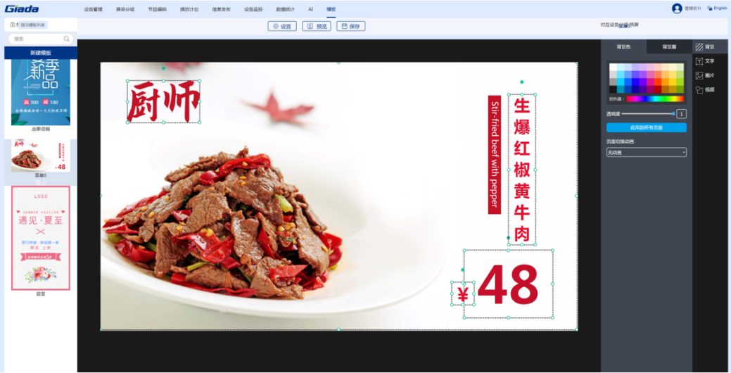 凯发(中国)科技智慧餐厅综合解决方案是由智能零售管理系统搭载公司自研的数字标牌播放器组成的软硬件一体化方案。该系统针对餐厅、酒店等不同行业提供典型节目模板,支持手机、电脑建议操作。用户只需3步即可完成节目的制作播放:选择节目模板,更换自己的素材(视频、图片和文字),预览保存及播放。价格、优惠折扣等信息可随时更改。