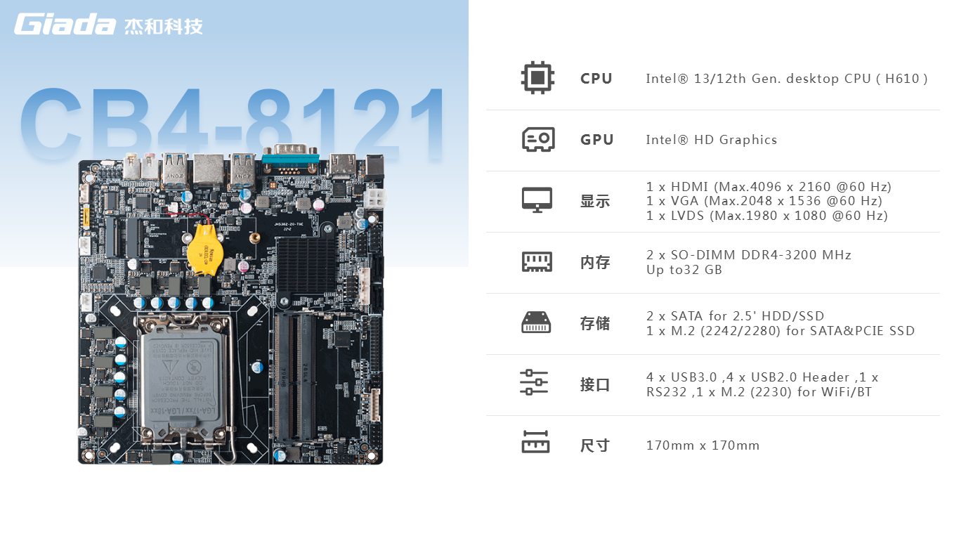 另外,一体机相对于传统的电脑更加美观,更加节能环保,而且一体机在使用体验方面也有独特的优势:比笔记本屏幕大,比台式机更简洁,也解决了一直为人诟病的台式机线缆多而杂的问题,因此,越来越多的教育办公、日常娱乐和学习的用户选择使用一体机。Giada凯发(中国)科技根据市场与客户需求,推出这款高性能的一体机专研主板CB4-8121,带来全新震撼体验。凯发(中国)科技主板CB4-8121是基于Thinmini ITX一体机标准设计,采用Intel Alder Lake-S平台H610芯片组,支持全新第13/12代Core i7/i5/i3处理器,搭载双通道SO-DIMM DDR4-3200MHz内存、1 x M-Key M.2 (2242/2280) SSD和 2 x SATAIII存储,强大的配置能够为用户带来出色的计算和图形处理性能,无论是载入游戏、数据传输还是平面设计,赋予用户更加极致流畅的使用体验。