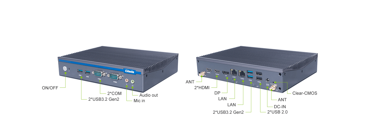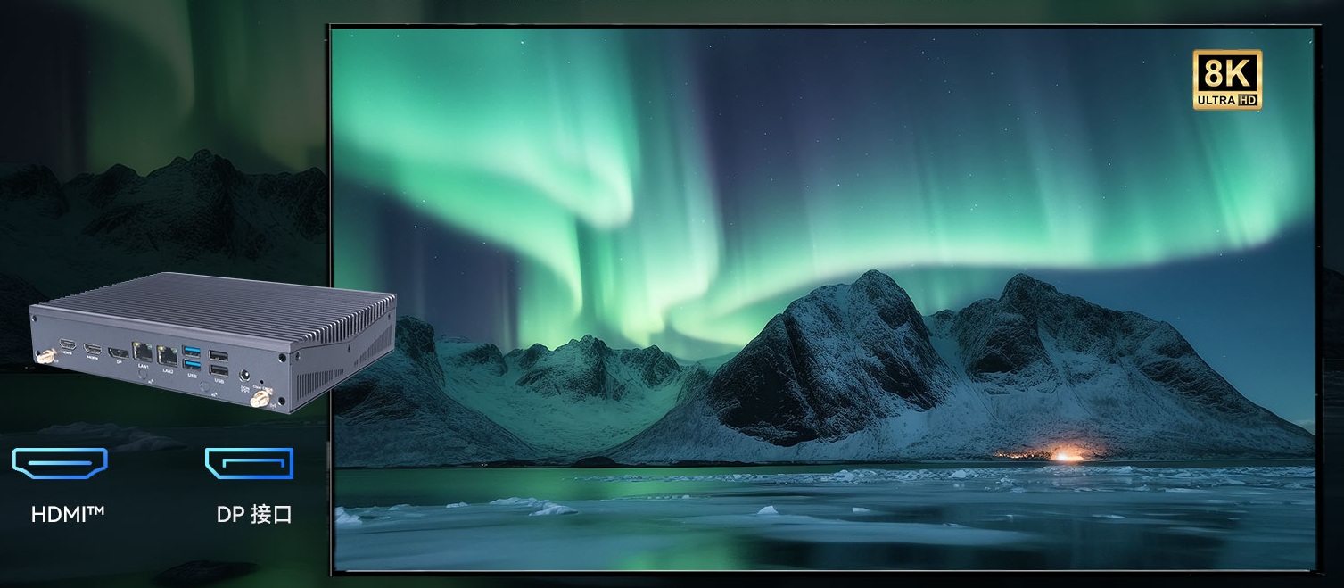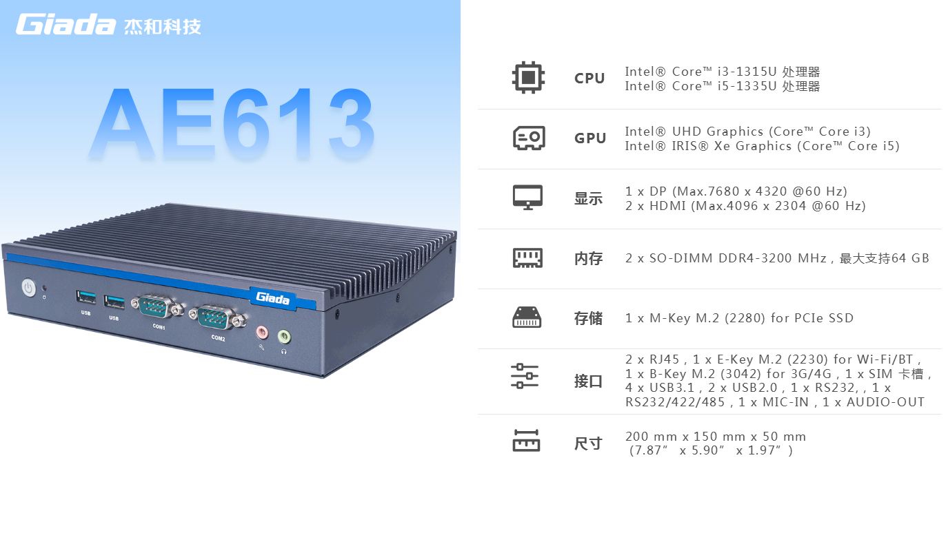 凯发(中国)科技AE613支持Windows 11 (64bit) /Linux Ubuntu (64bit)系统,双千兆自适应RJ45网口,4 x USB3.1 (10 Gbps),2 x USB2.0,1 x RS232,,1 x RS232/422/485,1 x MIC-IN,1 x AUDIO-OUT,丰富的I/O功能接口,实现更多功能扩展。