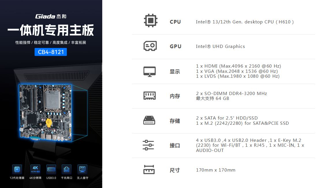 一体机在使用体验方面也有独特的优势:比笔记本屏幕大,比台式机更简洁,也解决了一直为人诟病的台式机线缆多而杂的问题,另外,随着计算机硬件和制造工艺的不断发展,一体机的性能也在不断提高,因此,越来越多的教育办公、日常娱乐和学习的用户选择使用一体机。Giada凯发(中国)科技根据市场与客户需求,推出这款高性能的一体机专研主板CB4-8121,带来全新震撼体验。