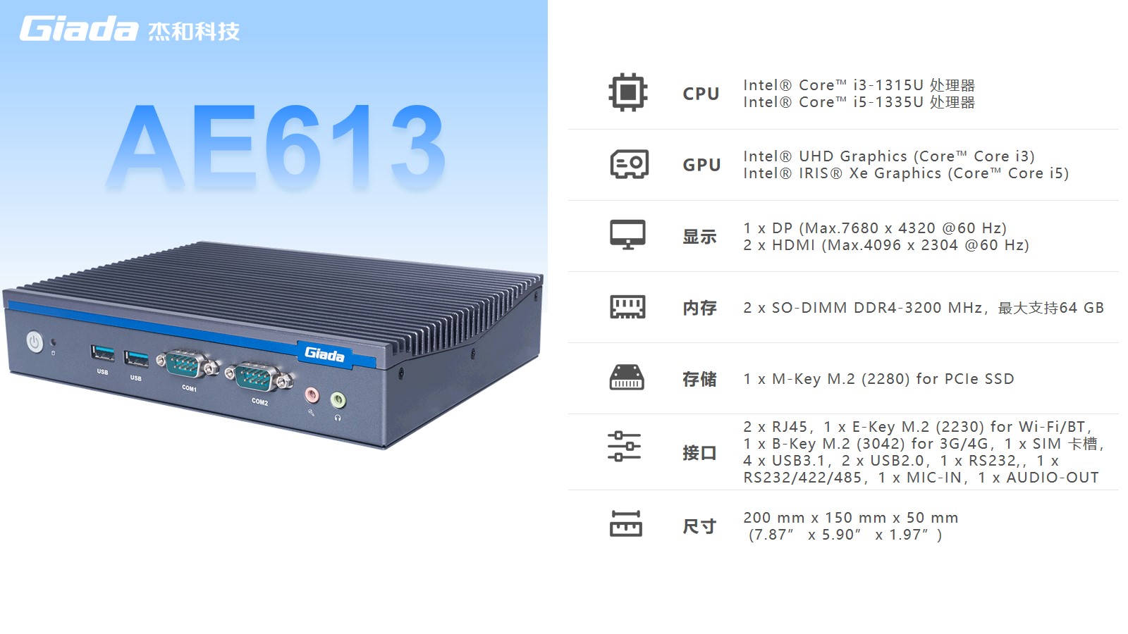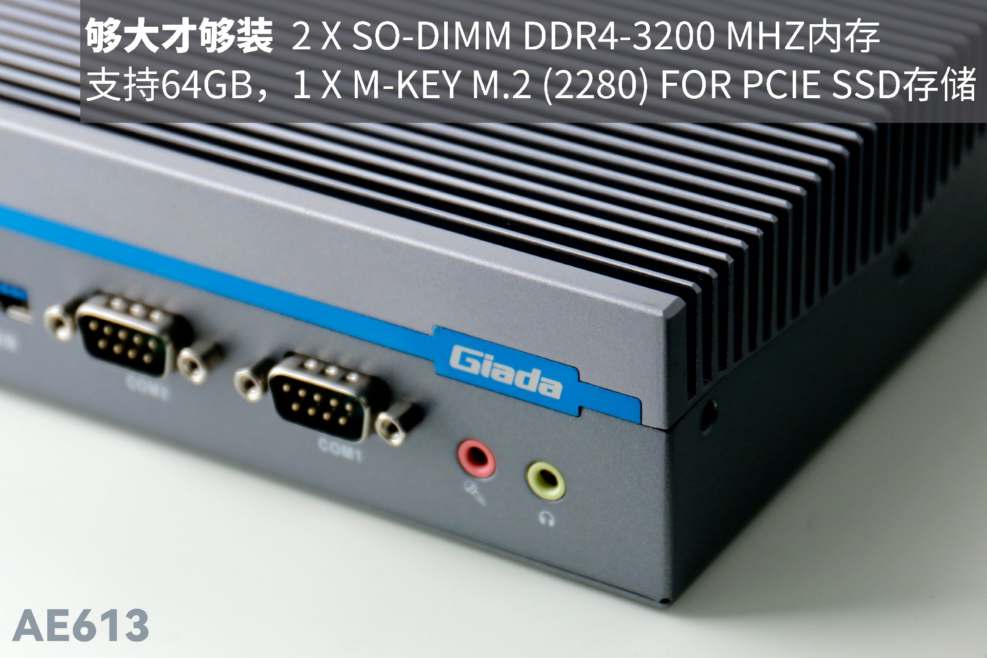 凯发(中国)AE613拥有2 x SO-DIMM DDR4-3200 MHz内存、1 x M-Key M.2 (2280) for PCIe SSD存储,最大支持64GB,无论是处理复杂的多任务环境、还是运行高负载的软件都游刃有余。