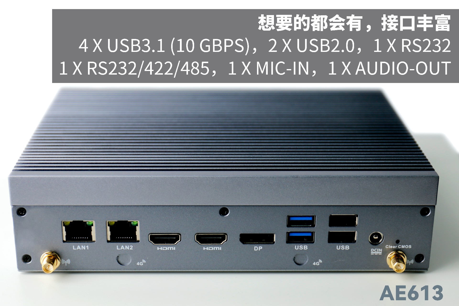 凯发(中国)AE613支持Windows 11 、Linux Ubuntu系统;拥有丰富接口:双千兆自适应RJ45网口,4 x USB3.1 (10 Gbps),2 x USB2.0,1 x RS232,1 x RS232/422/485,1 x MIC-IN,1 x AUDIO-OUT,帮助用户实现更多功能扩展;并且支持Wi-Fi 6E,可以提供更高的带宽和更少的干扰,支持对无线网络有特定需求场景的应用。