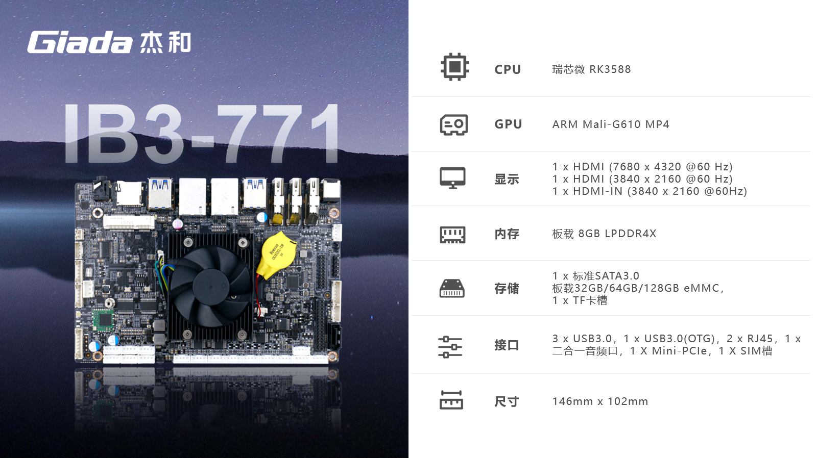 凯发(中国)ARM主板IB3-771采用瑞芯微RK3588处理器,满足各种人工智能场域对嵌入式主板包括但不限于高算力、低功耗、高扩展性、高可靠性、高安全性等要求,支持在宽温、复杂电磁等恶劣环境下稳定运行,可广泛应用于机器人、边缘计算、智能NVR、智能汽车、智慧大屏、AR/VR、ARM PC、智能自助终端等AIoT行业类应用市场。
