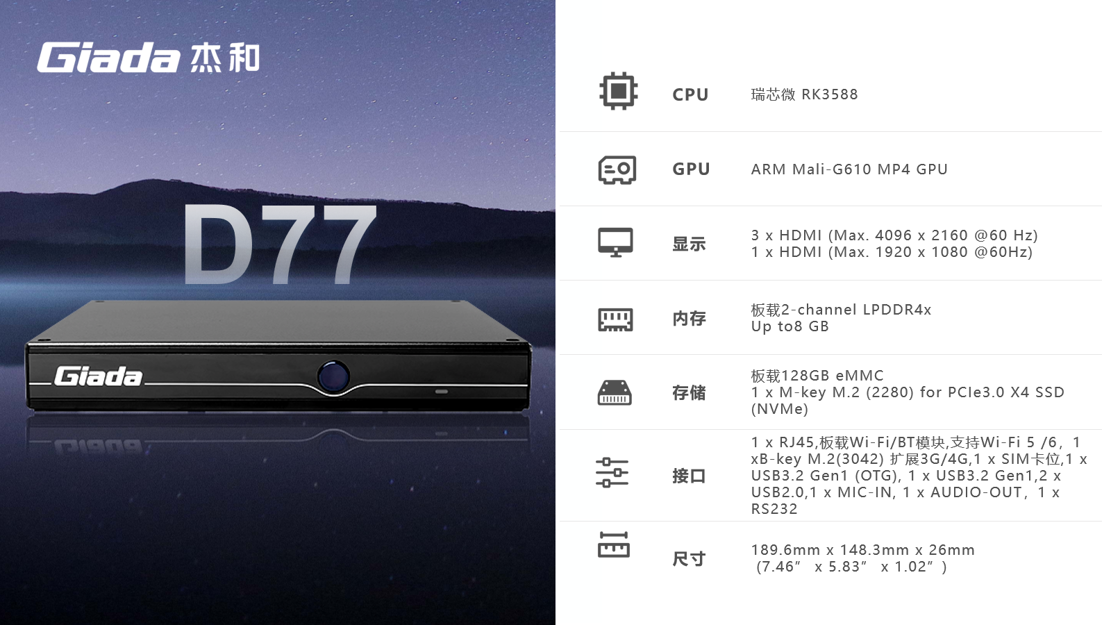 AIoT的落地场景包括智慧工业、智慧零售、智慧社区、智慧城市、智能显示、医疗健康等领域,在实际落地时,对物联网硬件设备的AI算力、数据运算、存储能力,稳定性及可扩展性能等提出更高要求,Giada凯发(中国)科技作为行业领先的物联网数智化技术服务商,深入布局AIoT领域,推出AI产品系列,包括3.5寸主板、嵌入式整机、边缘计算盒子等,全方位覆盖了入门级到高性能级,满足不同应用场景的需求,为用户赋能。