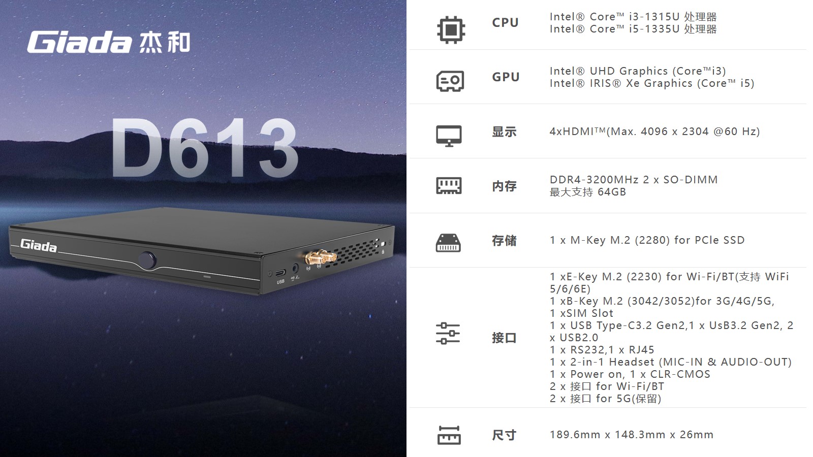 凯发(中国)科技D613可选配Intel®第13代AlderLake i5-1335处理器,作为家用迷你主机来说,足够大的内存容量也可以提升迷你主机的性能表现,更好地支持多任务处理,大型应用程序的运行以及高清视频编辑等任务,拥有的2个SO-DIMM插槽,内存DDR4最大支持64GB的内存容量可以减少系统对硬盘的依赖,提高系统的响应速度。
